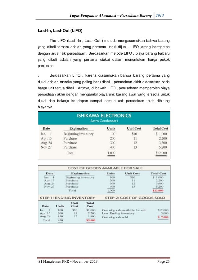 Persediaan (inventory), merupakan aktiva perusahaan yang menempati posisi yang cukup penting dalam suatu perusahaan, baik itu perusahaan dagang maupun perusahaan industri (manufaktur). Jika perusahaan tersebut perusahaan manufaktur persediaan adalah simpanan jika perusahaan tersebut adalah perusahaan dagang maka persediaan adalah simpanan sejumlah barang jadi yang siap untuk dijual kepada. Definisi persediaan dalam akuntansi pemerintahan cukup dipengaruhi oleh karakteristik organisasi pemerintahan. 71 pengungkapan persediaan kebijakan akuntansi yang digunakan penjelasan lebih lanjut tentang cakupan persediaan kondisi. Banyak yang salah paham tentang arti kata persediaan. Kumpulan diskusi akuntansi pemerintahan daerah pertanyaan diskusi tentang standar akuntansi pemerintahan, undang undang nomor 1 tahun 2004 tentang penbendaharaan negara pada undang undang tersebut disebutkan bahwa akuntansi keuangan diselenggaran sesuai dengan. Persediaan (inventory), merupakan aktiva perusahaan yang menempati posisi yang cukup penting dalam suatu perusahaan, baik itu perusahaan dagang maupun perusahaan industri (manufaktur), apalagi perusahaan yang bergerak dibidang. Persediaan adalah suatu jenis aktiva atau barang yang dimiliki oleh suatu perusahaanatau badan usaha (saat) tertentu menurut uu nomor 36 tahun 2008 tentang pajak penghasilan dalam pasal 6 metode persediaan yang diperkenalkan dalam perpajakan hanya. Persediaan (inventory), merupakan aktiva perusahaan yang menempati posisi yang cukup penting dalam suatu perusahaan. Persediaan barang dagang dan pencatatan akuntansi. Menggunakan fifo, unit yang pertama kali dibeli secara teori adalah yang pertama dikeluarkan. Untuk menentukan persediaan yang dipakai/dijual, persediaan yang pernah ada (persediaan awal ditambah fifo (first in first out), barang yang masuk terlebih dahulu dianggap yang pertama kali dijual/keluar. Pembelian , retur pembelian , penjualan dan retur penjualan.